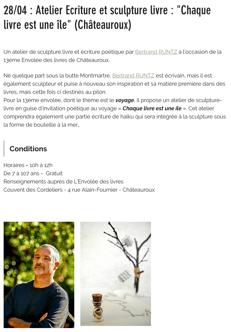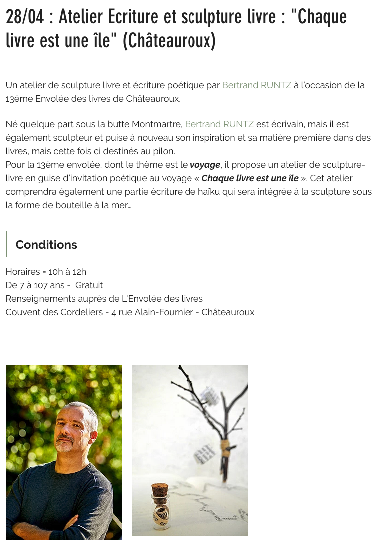 atelier L’envollée des livres Publié 9 avril 2019 à 762 × 1093 dans Dates des prochaines rencontres/dédicaces/ateliers d’écriture & sculpture. ← Précédent Suivant →