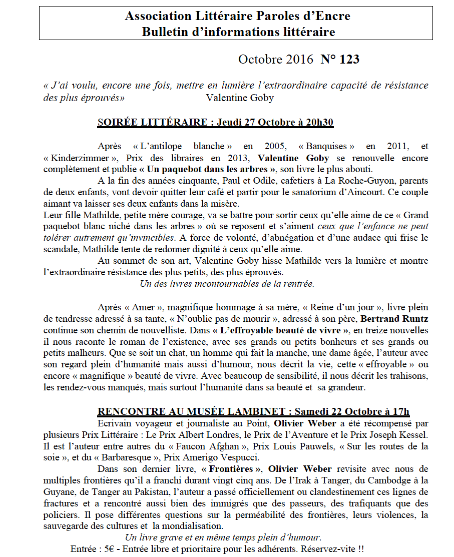 paroles d’encre octobre 2016 Publié 4 octobre 2016 à 907 × 1113 dans Dates des prochaines rencontres/dédicaces/ateliers d’écriture & sculpture. ← Précédent Suivant →