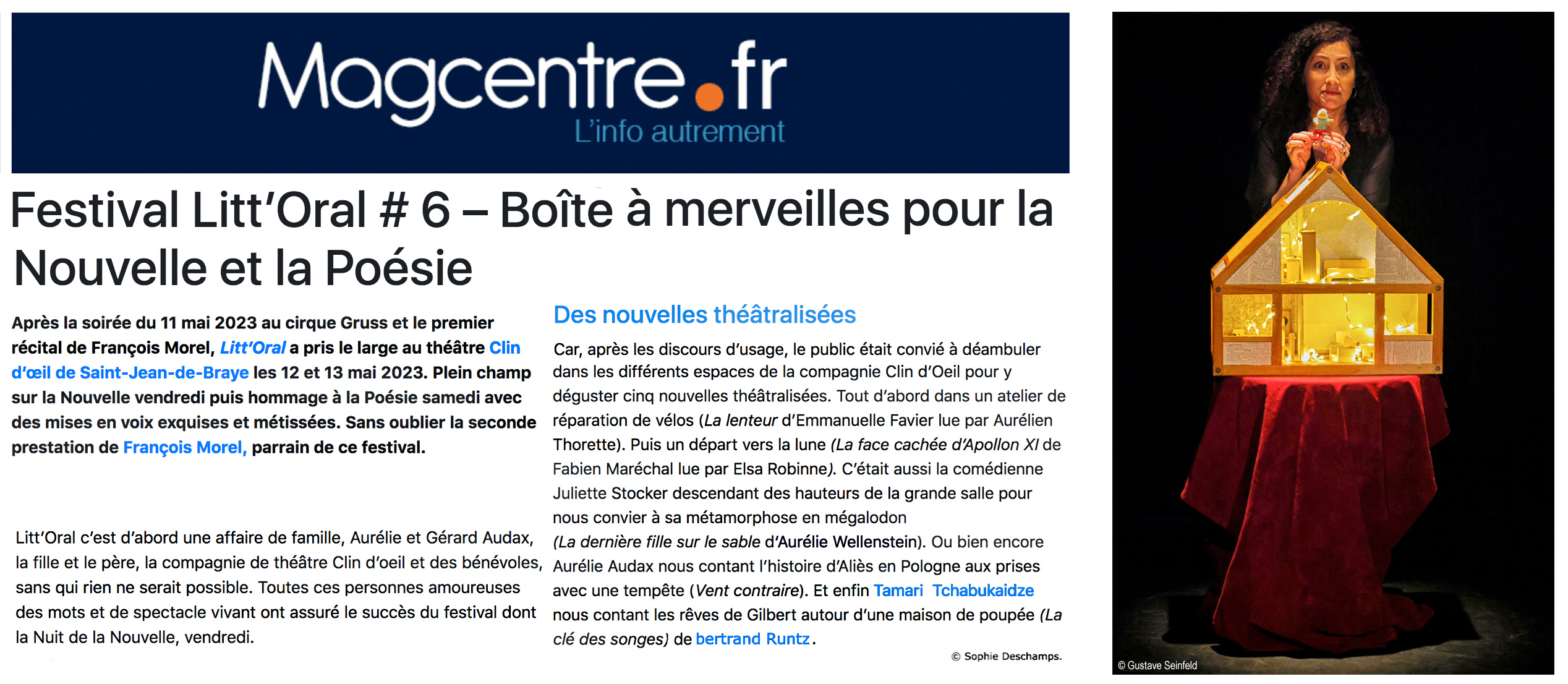 Les médiations se font en binôme avec des comédiens et des comédiennes qui choisissent au préalable l’un de mes textes et en font une lecture scénarisée aux élèves. Puis en mai, lors de la manifestation « La nuit de la nouvelle » organisée au Théâtre Clin d’œil, ces textes, ainsi que ceux des autres auteurs parrains et marraines, sont joués devant le public.