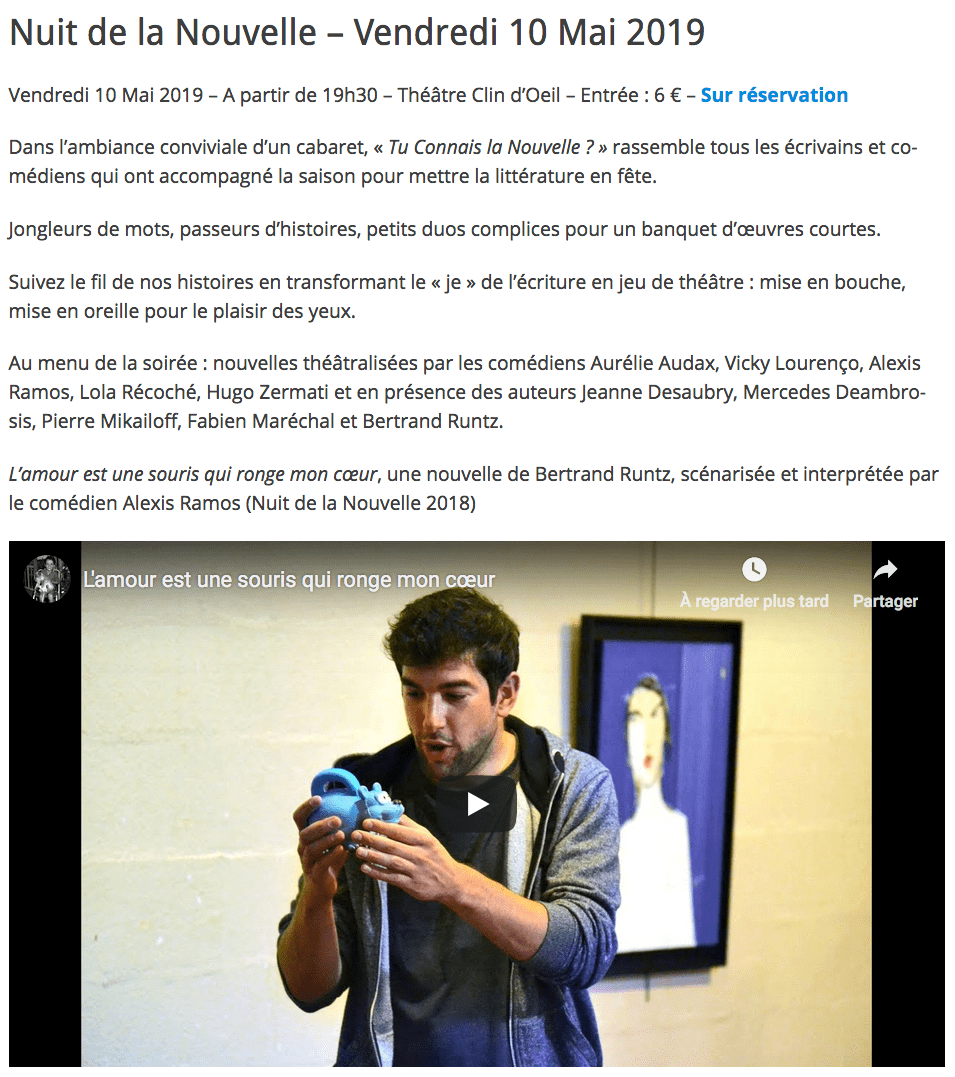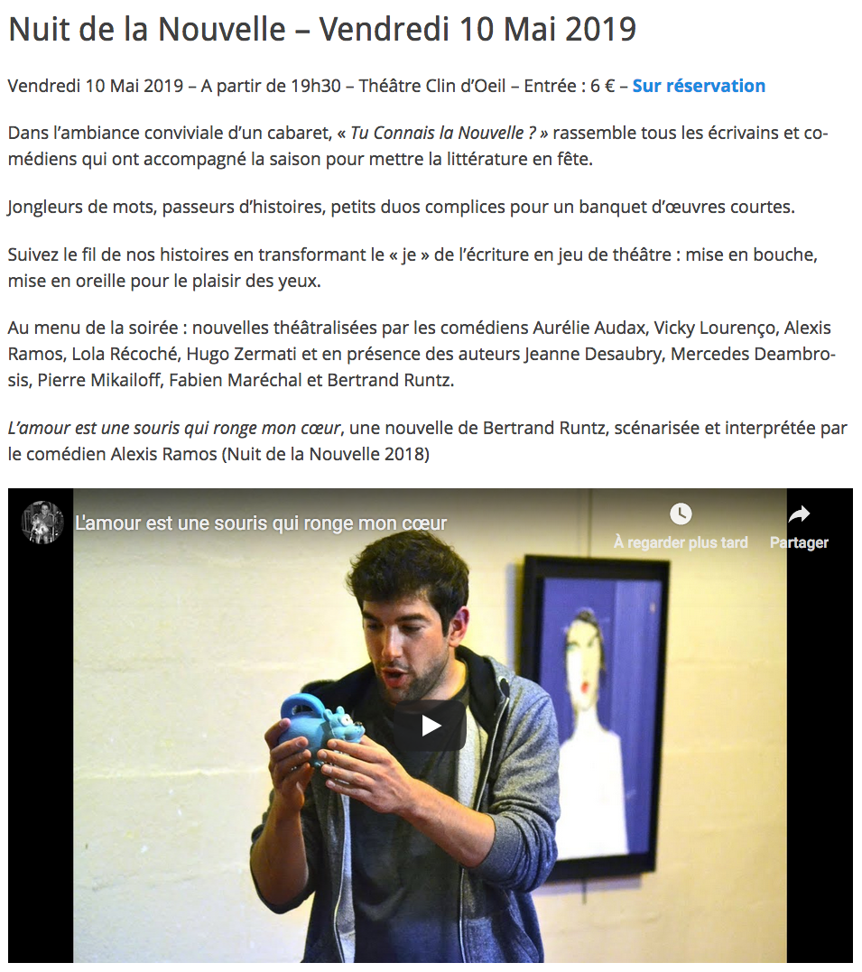 Alexis Ramos interprétant ma nouvelle « L’amour est une souris qui ronge mon coeur » Publié 7 juin 2023 à 955 × 1077 dans Ateliers d’écriture avec l’association « Tu Connais La Nouvelle ? » ← Précédent Suivant → J’aime chargement…