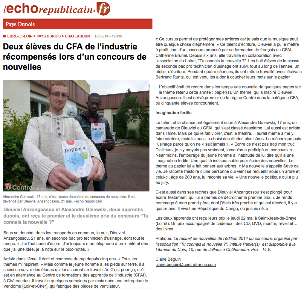 Article l’Echo républicain – Deux élès du CFA industrie de Châteaudun récompensé au concours de nouvelles Publié 7 juin 2023 à 1017 × 978 dans Ateliers d’écriture avec l’association « Tu Connais La Nouvelle ? » ← Précédent Suivant → J’aime chargement…