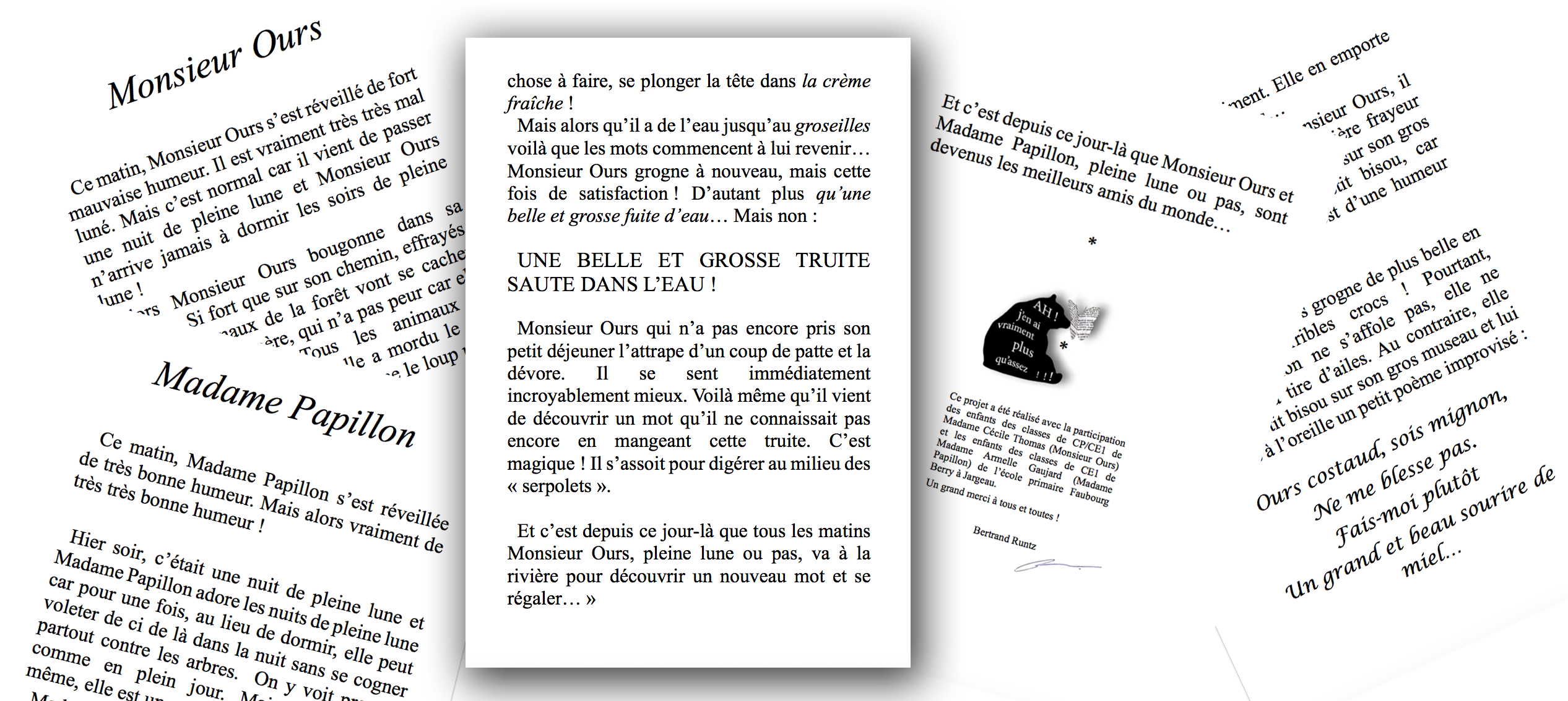 « Monsieur Ours & Madame Papillon » – projet mixte écriture et sculpture – école élémentaire Faubourg Berry Petits de Jargeau © B. Runtz Publié 7 juin 2023 à 2533 × 1134 dans ATELIERS D’ARTCRITURE ← Précédent Suivant → J’aime chargement…